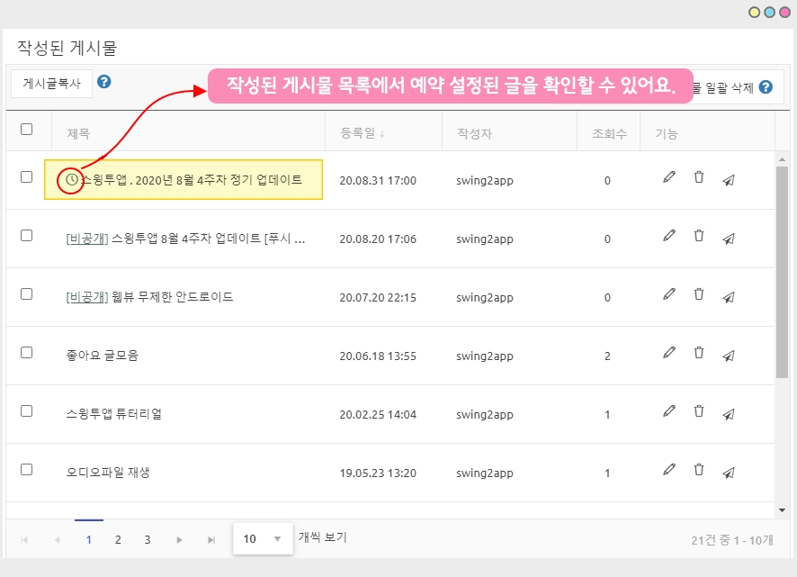앱을 실행해서 작성된 게시판으로 이동하시면, 예약을 설정해놓은 시간 전까지는 글이 노출되지 않구요.