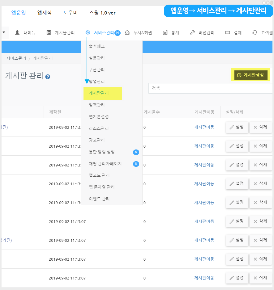1. 앱운영 페이지 → 서비스관리→ 게시판관리 이동합니다.