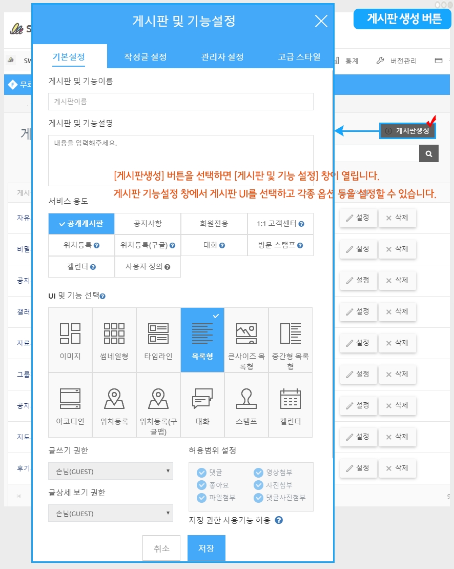 게시판에서 이용되는 다양한 기능들을 확인하여 설정할 수 있습니다.