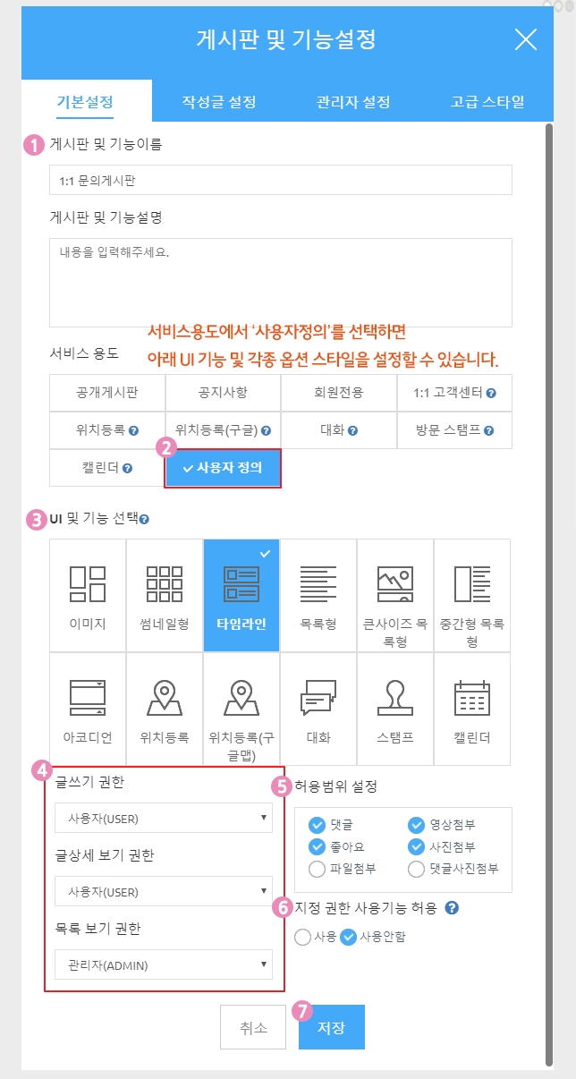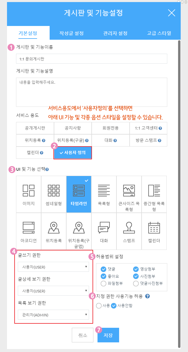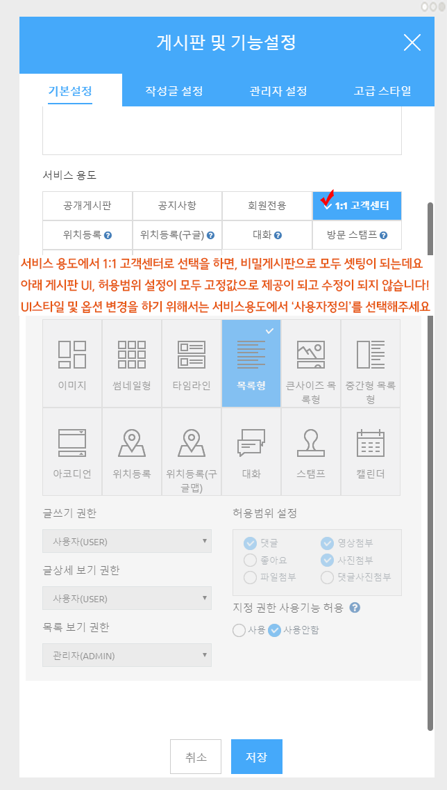 서비스용도가 ‘사용자 정의’가 아닐 경우 아래 게시판 UI스타일, 허용 범위 설정이 모두 고정값으로 제공되어 수정이 불가합니다.
