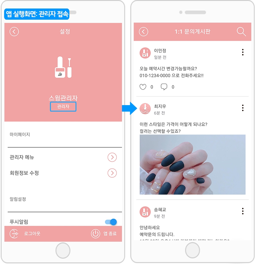 글을 작성한 사용자와 관리자만 확인할 수 있기 때문에 앱을 이용하는 사용자들은 부담없이 게시판에 글을 작성할 수 있구요.