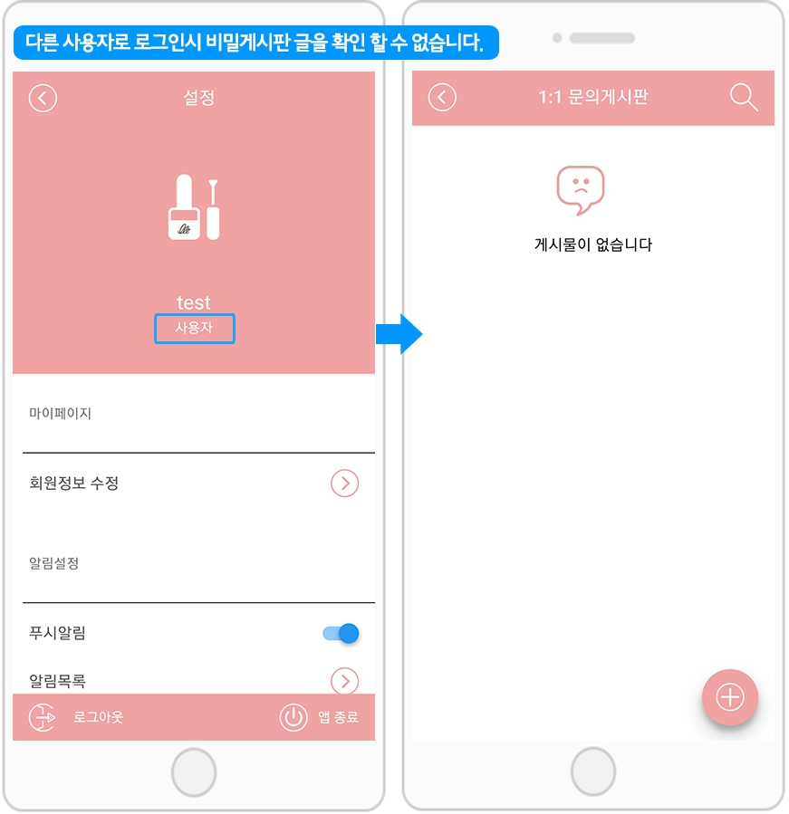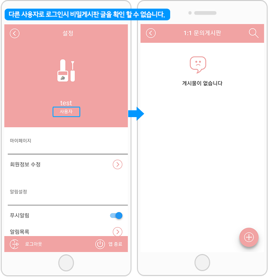 앱을 실행해서 1:1고객센터(비밀게시판)이 어떻게 운영되는지 확인해볼게요.