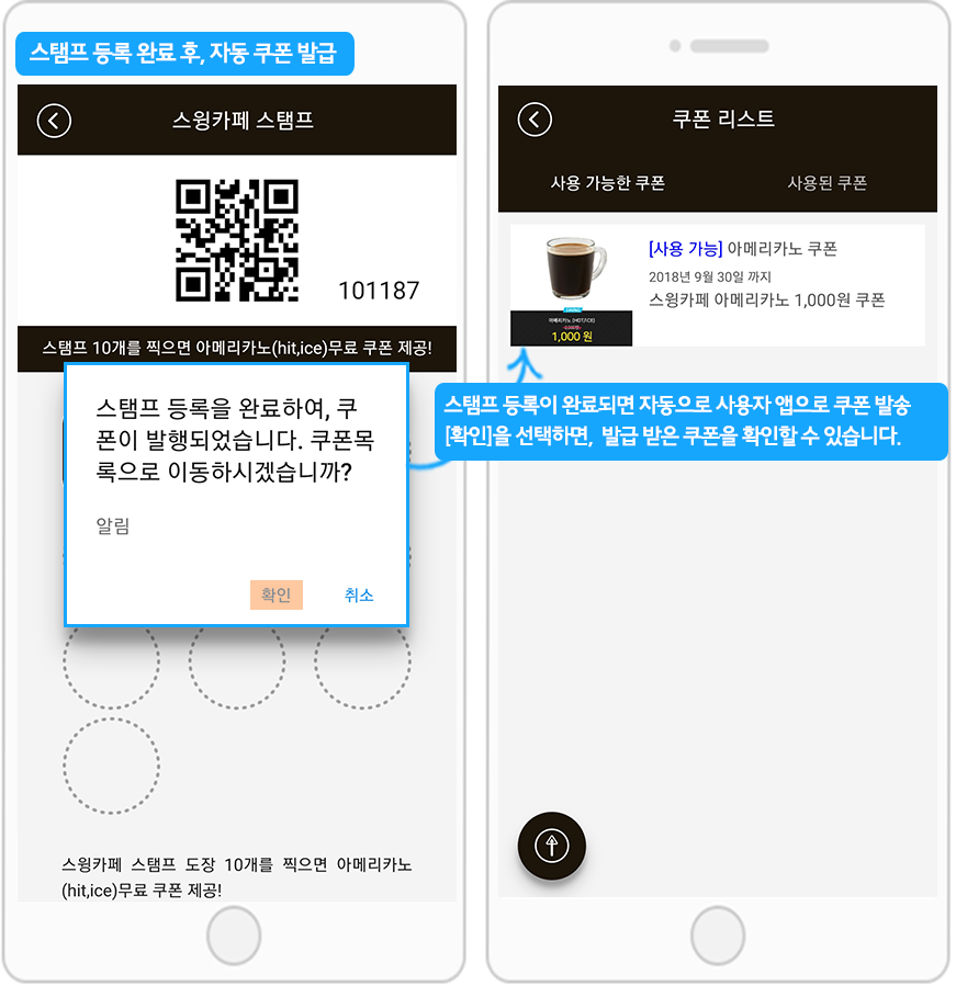 스탬프 등록이 완료되면 자동으로 스탬프가 초기화(리셋)되며, 사용자 앱으로 관리자가 설정해놓은 쿠폰이 자동 발행되는 기능입니다.