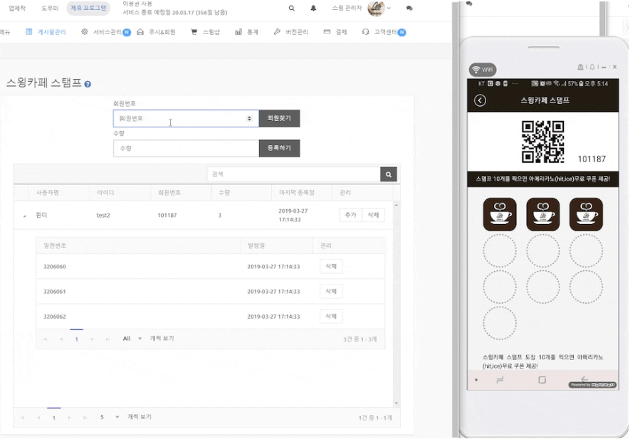 따라서 관리자는 스윙 스탬프 관리화면에서 회원을 조회한뒤, 다 채워진 10개를 삭제하는 방법으로 관리해야 했어요.