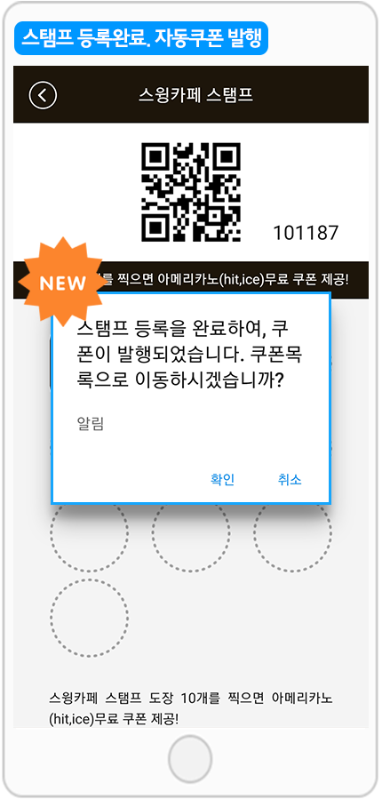 관리자가 설정한 갯수만큼 스탬프 등록이 완료되면, 스탬프가 모두 리셋(사라지며)되면서 쿠폰이 발행되었다는 팝업창이 뜹니다.