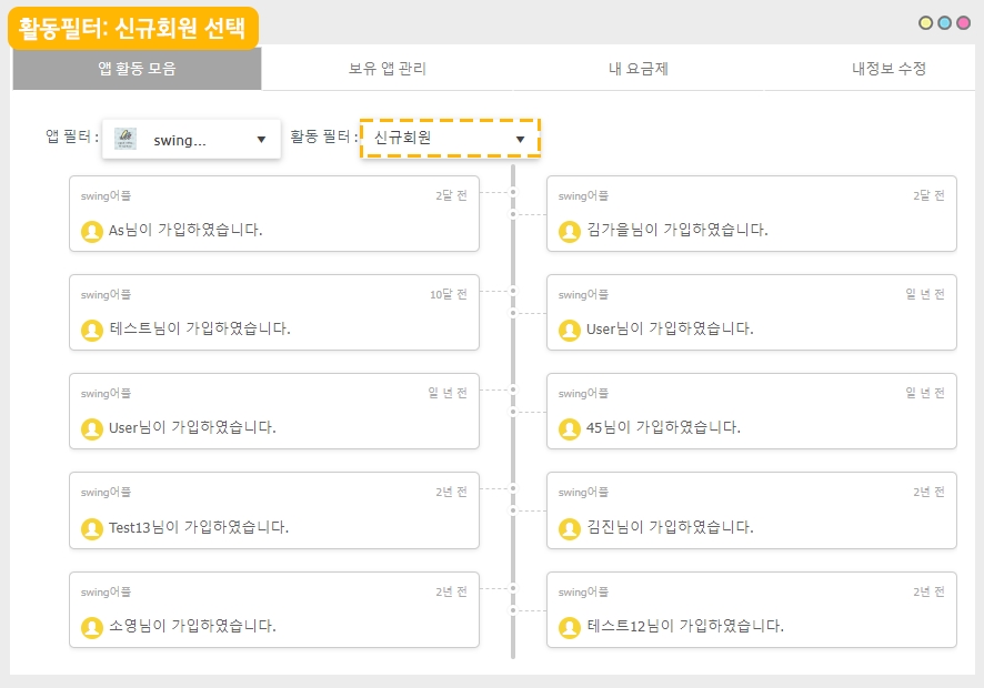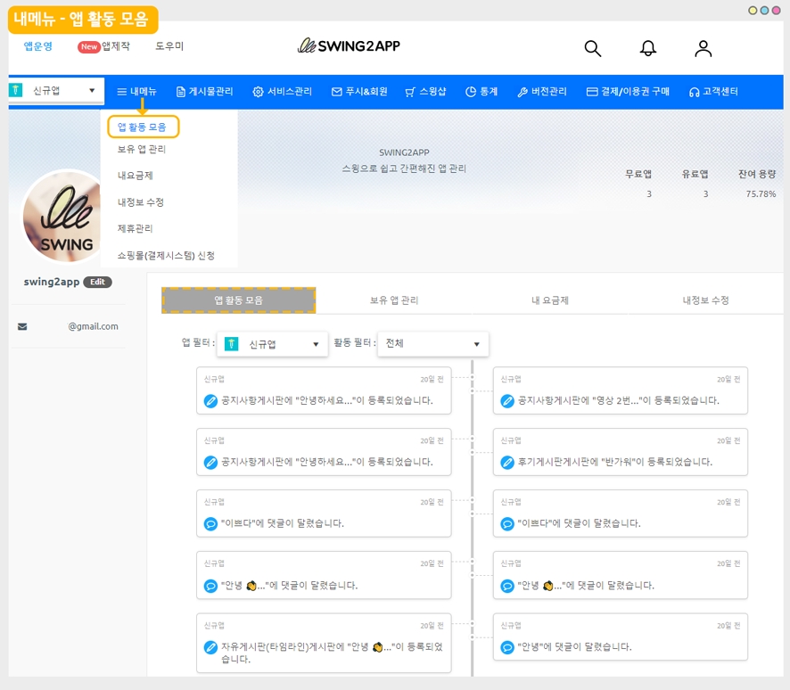 스윙투앱 앱운영 메뉴 중 ‘앱 활동 모음’ 이용방법에 대해 알려드립니다.