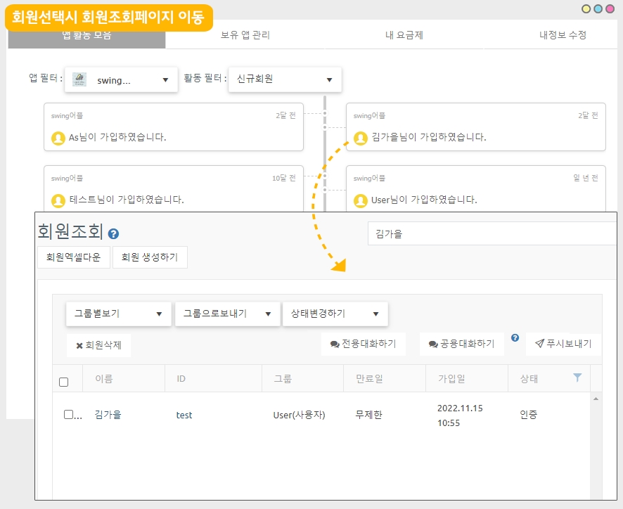 내 계정에 등록된 전체 앱 목록 확인, 앱에서 회원들이 확인할 수 있는 메뉴입니다.