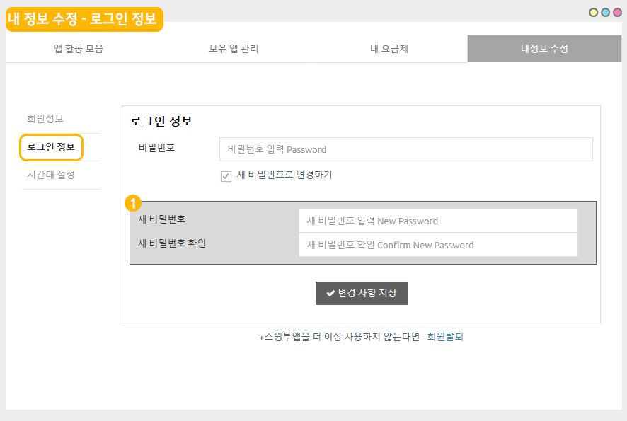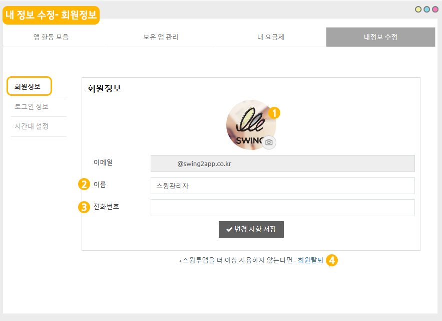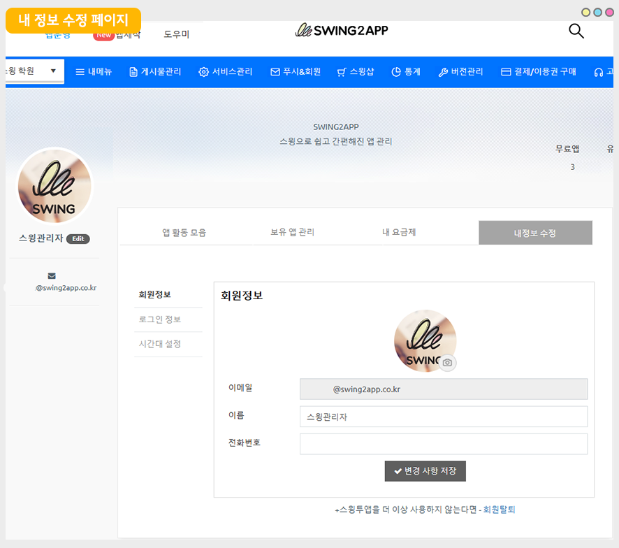 {% hint style="danger" %} <mark style="color:red;">\*스윙투앱에 가입한 계정 -이메일은 변경할 수 없습니다.</mark>&#x20;