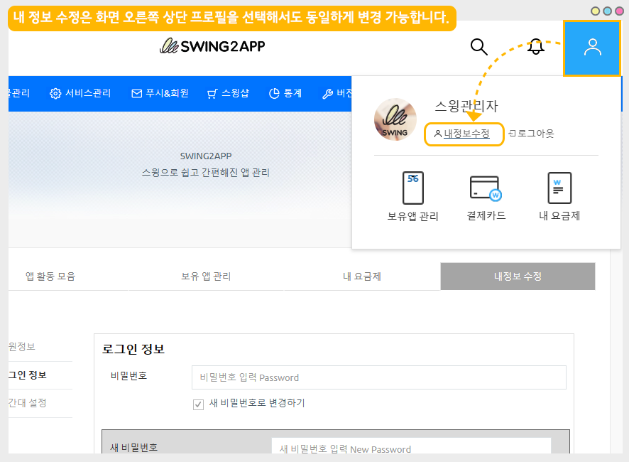 <mark style="color:blue;">**TIP.**</mark> 내 정보 수정은 내 메뉴에서 뿐만 아니라 프로필 아이콘을 선택해서도 이용 가능합니다.