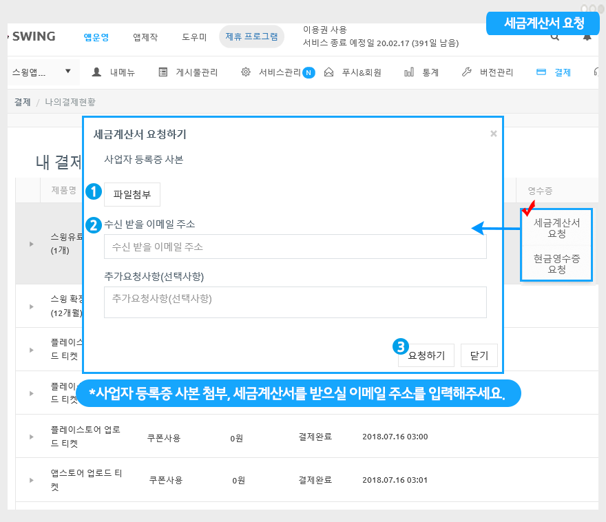 사업자등록증과 세금계산서를 받으실 이메일주소, 결제한 앱이름, 스윙계정(이메일주소)을 함께 기재해서 보내주시면 됩니다.