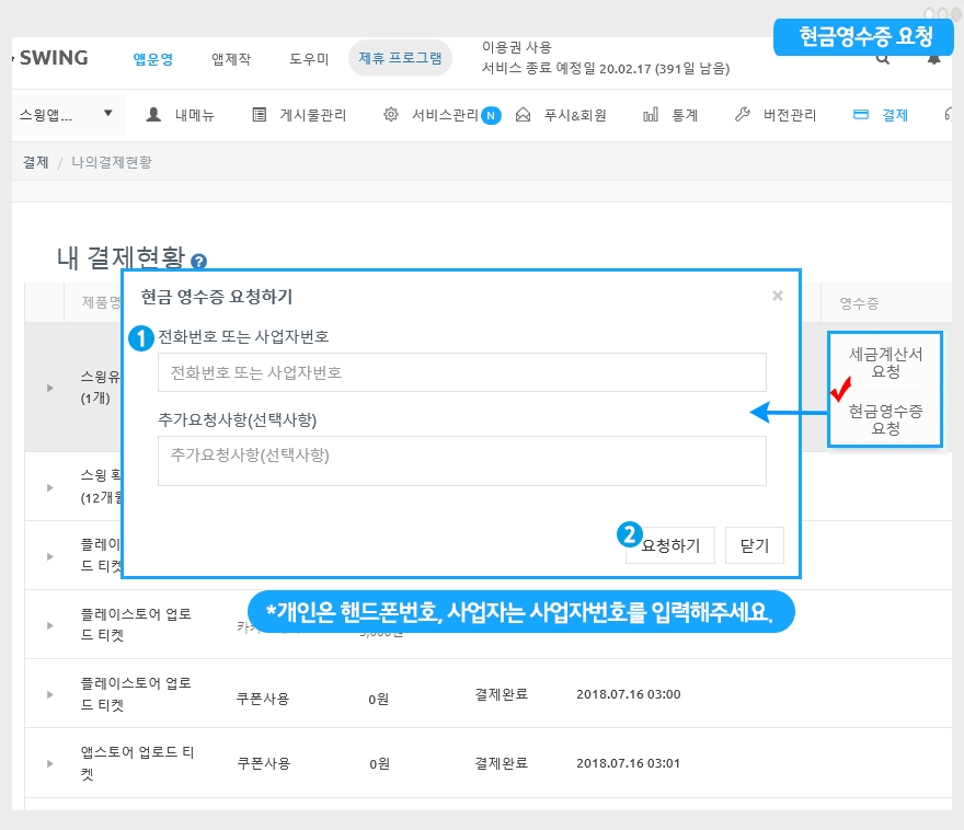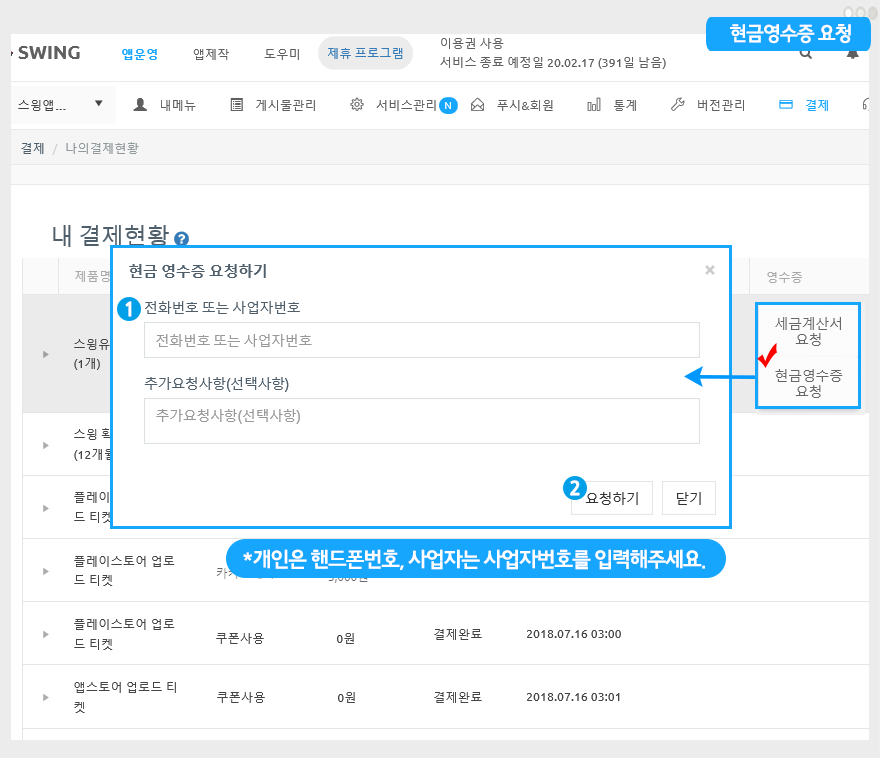 [현금영수증 요청] 버튼을 누르면 요청 팝업 창이 뜹니다.