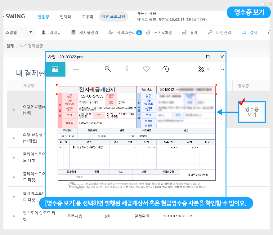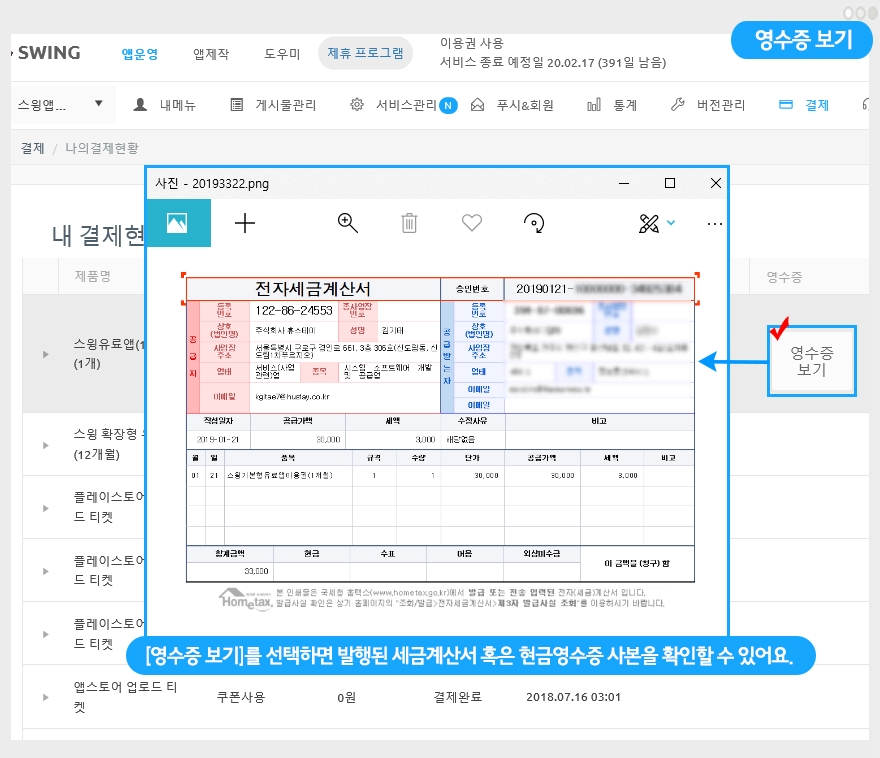 [영수증 보기]를 선택하면 발행된 세금계산서 혹은 현금영수증 사본 이미지를 확인할 수 있습니다.