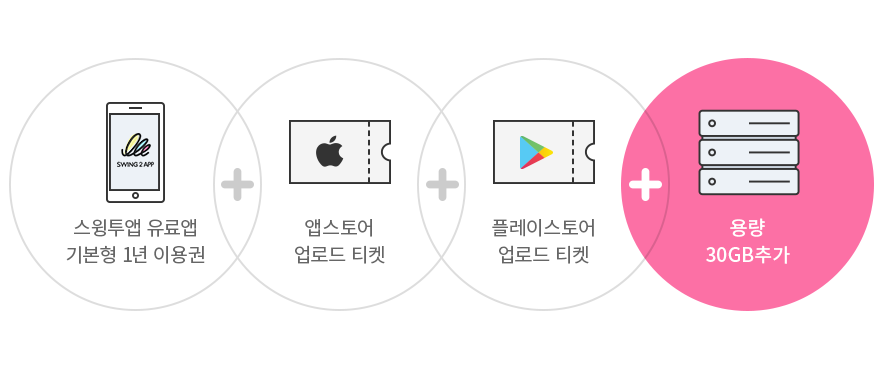 2) 대용량 패키지는 [스윙 기본형 유료앱 1년이용권+ 앱스토어 업로드티켓+플레이스토어 업로드티켓+앱 용량 30GB추가] 제공합니다.