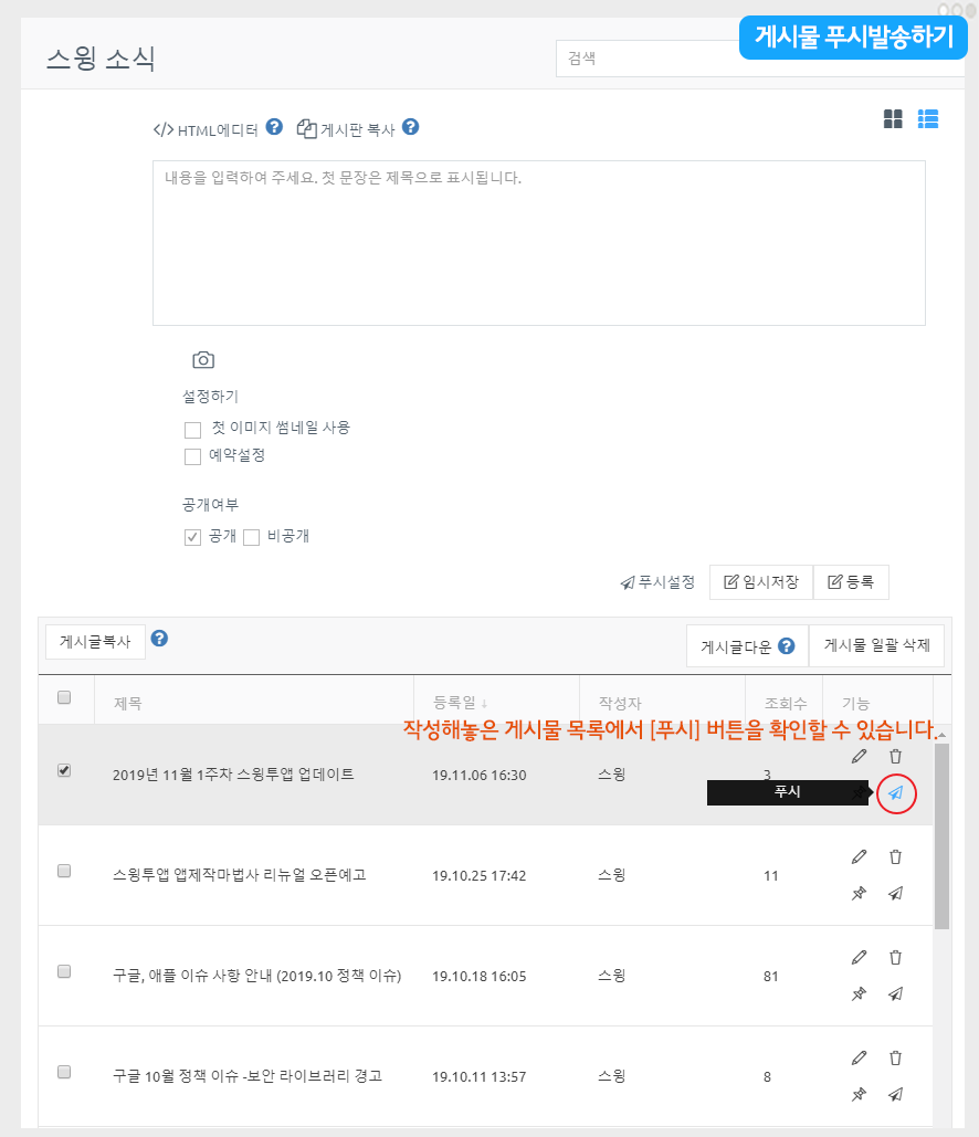 게시물관리에서 글쓰기 하단에 보시면 ‘푸시설정’ 버튼이 있어요.