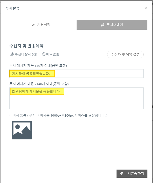푸시 아이콘을 선택하면 푸시발송 창이 뜹니다. 먼저 ‘기본설정’항목을 체크해주세요.