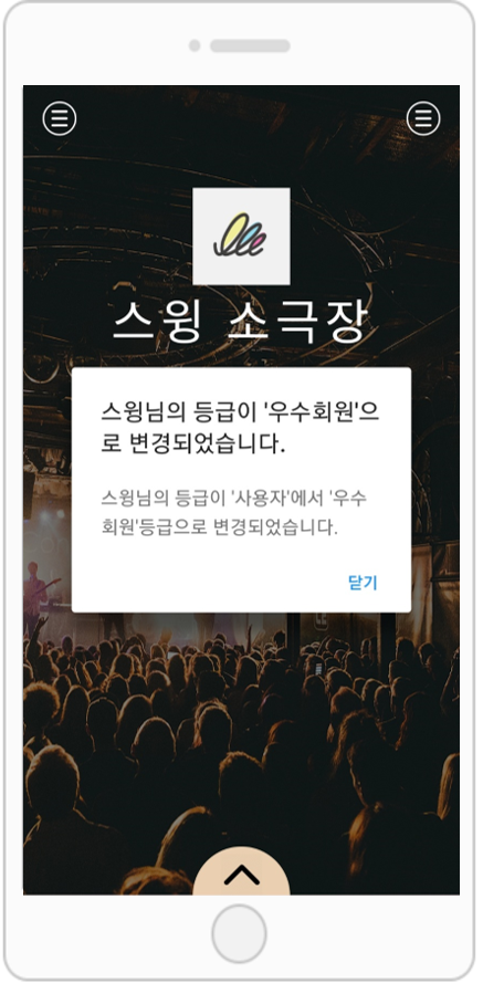 이렇게 해당 사용자의 등급이 ‘우수회원’으로 변경되었다는 메시지 창을 확인할 수 있구요.