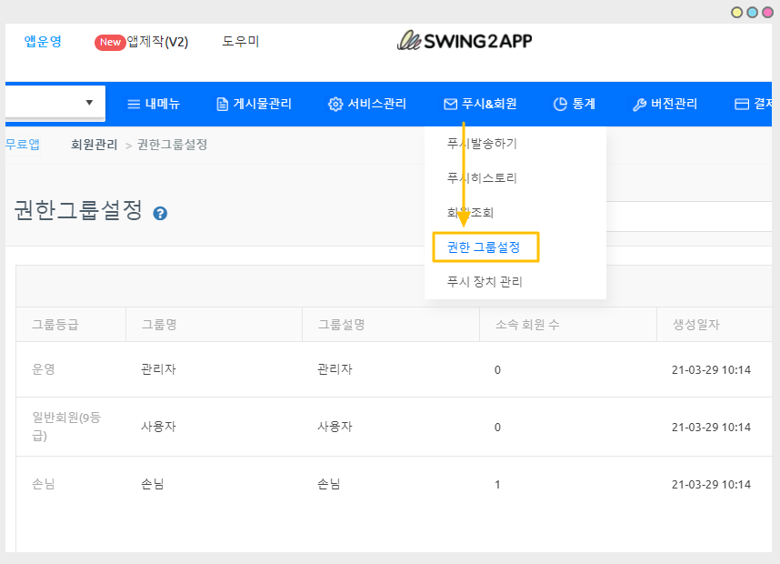 앱운영 페이지 → 푸시&회원 → 권한 그룹 설정 메뉴로 이동합니다.