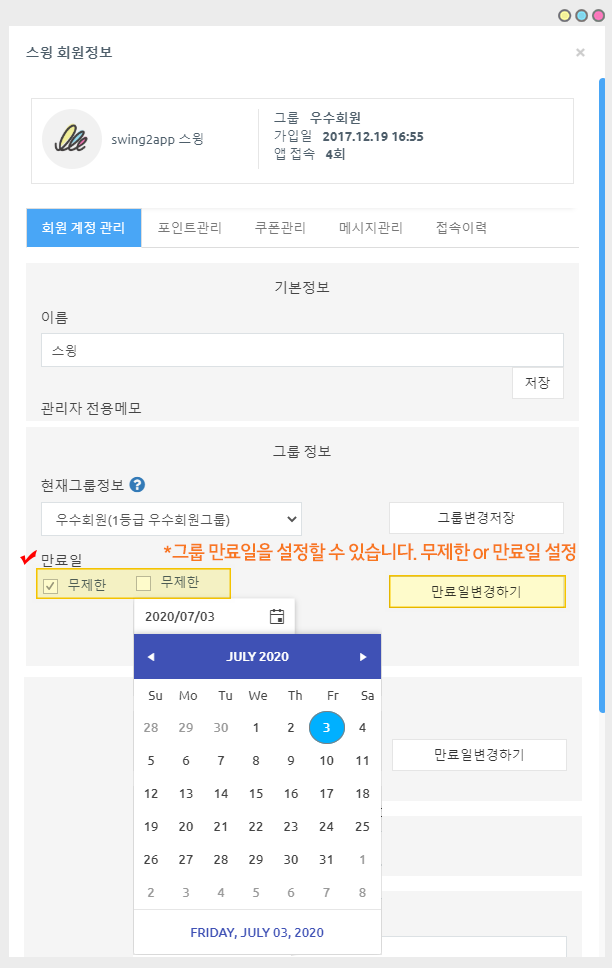 그룹을 지정하면 해당 사용자의 그룹 만료일을 설정할 수 있어요!!