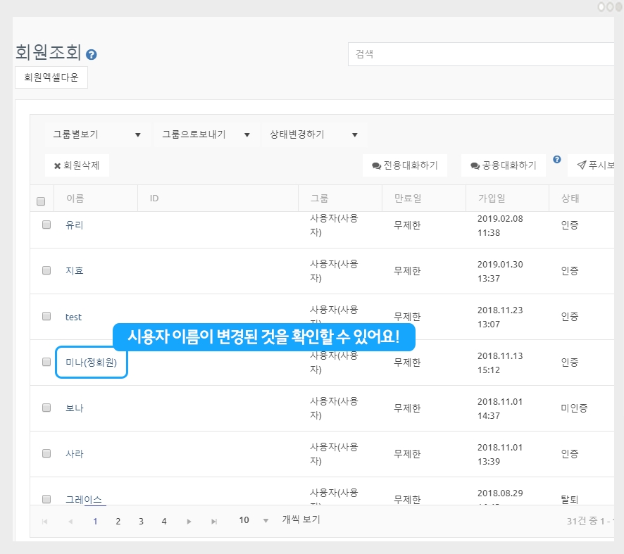 사용자(회원)의 이름이 관리자가 수정한 이름으로 변경된 것을 확인할 수 있어요.