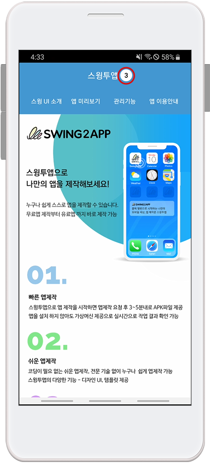 푸시 알림함은 홈화면 상단에 동그란 숫자 버튼으로 표시됩니다.