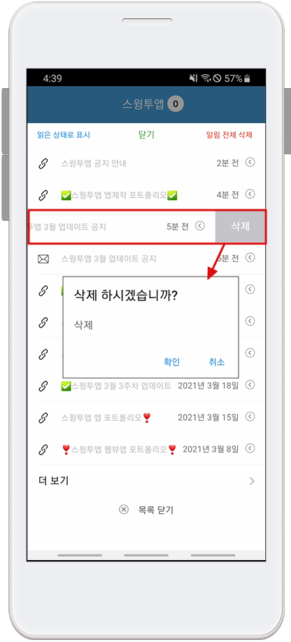 푸시를 받은 목록을 삭제할 수도 있고, 읽음으로 처리를 하는 등 다양한 방법으로 이용할 수 있습니다.