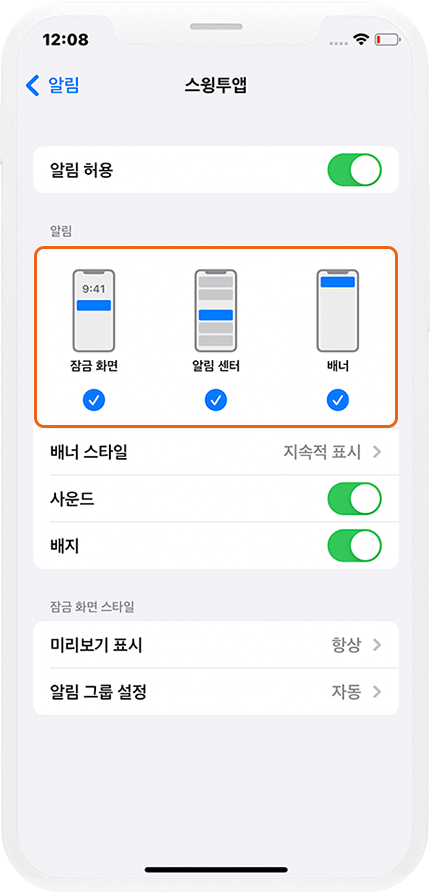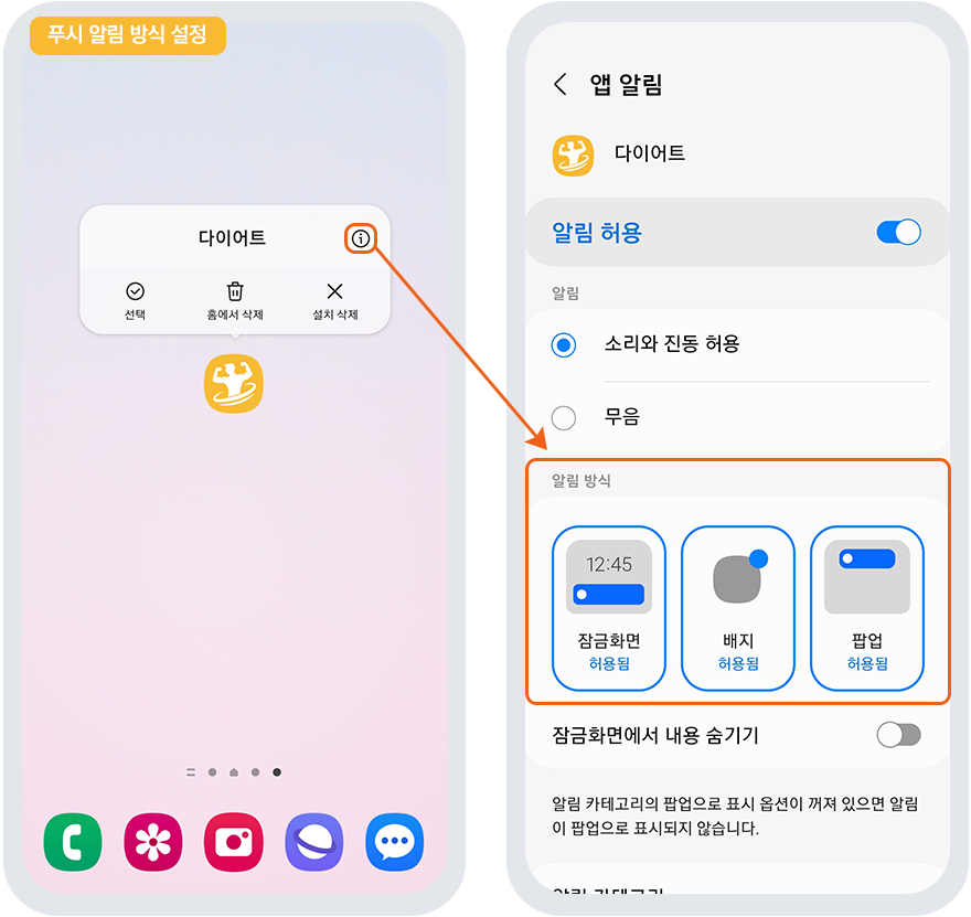사용자의 폰 앱 셋팅에 따라 3개 항목 모두 알림 설정이 되어 있거나, 특정 알림 방식으로만 셋팅할 수 있어요.