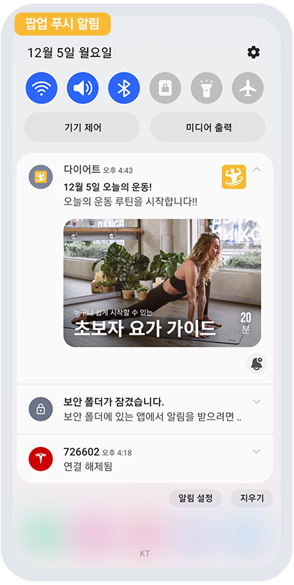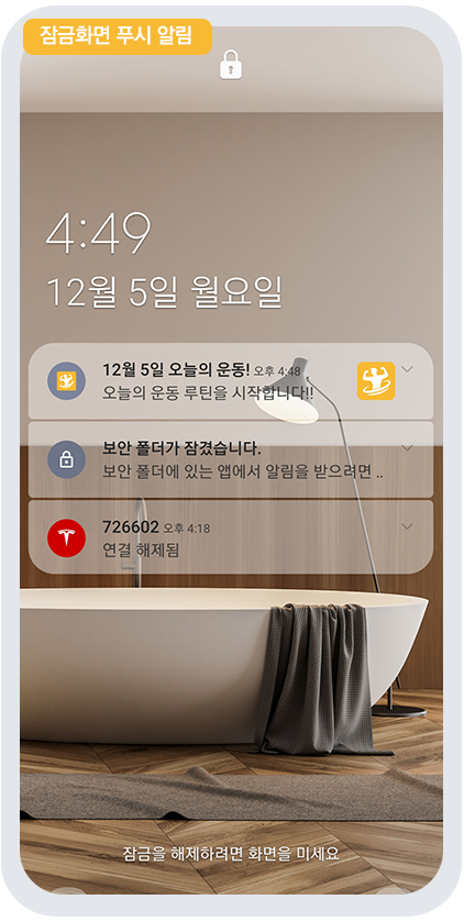 핸드폰 잠금 화면 설정시, 잠금 화면 위로 푸시 알림이 들어오구요.
