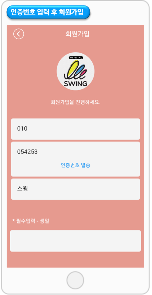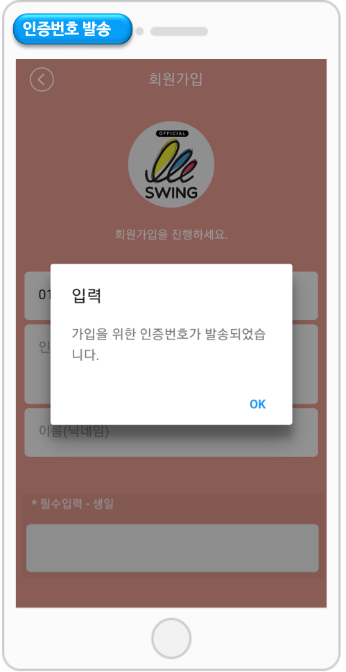 인증번호 발송을 누르면, 스윙에서 인증번호를 발송해요.
