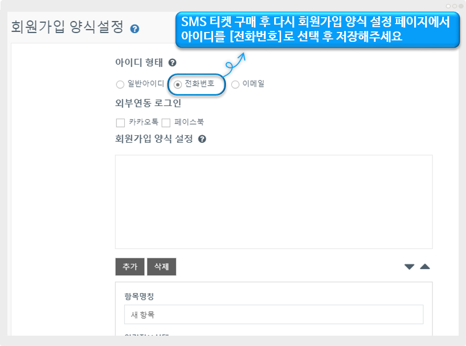 SMS티켓 구매 후, 다시 회원가입 양식 설정 페이지에서 아이디를 "전화번호" 선택 후 저장해주세요.
