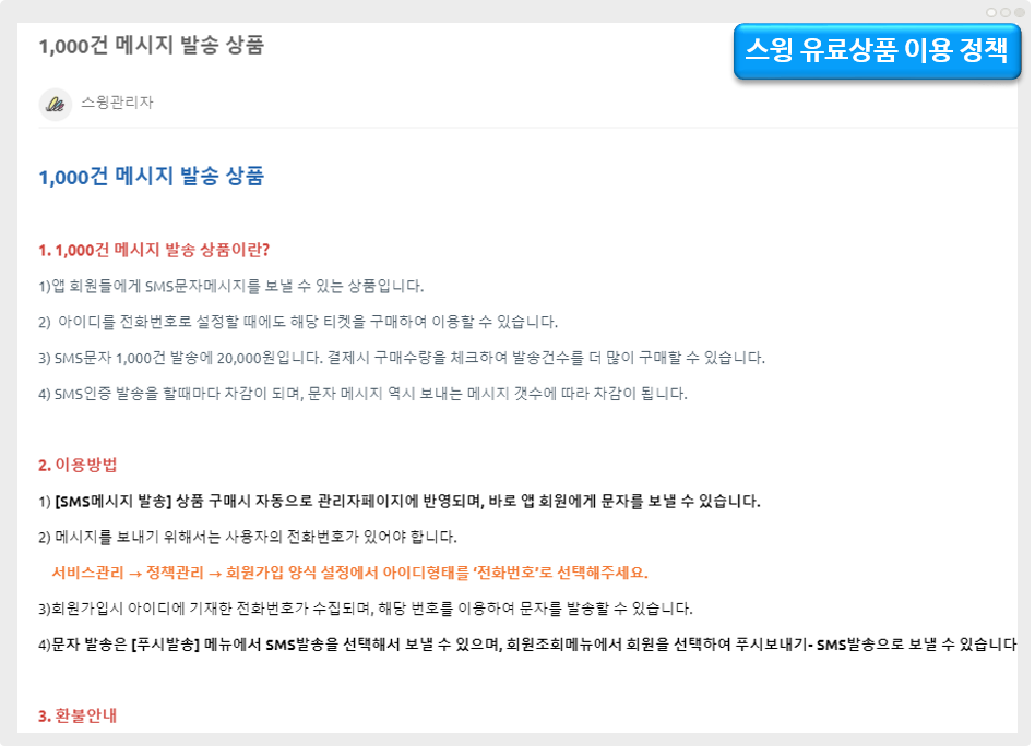 스윙 결제 페이지에서 [1,000건 SMS 발송권] 상품 구매시 자동으로 관리자 페이지에 반영이 되기 때문에 바로 사용이 가능해요!