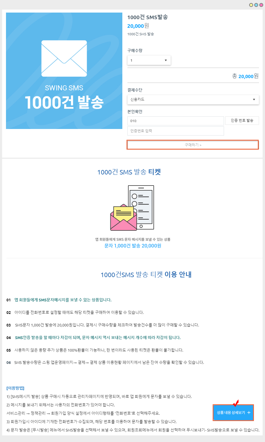 [1,000건 SMS발송 티켓(20,000원)]을 구매해주세요.