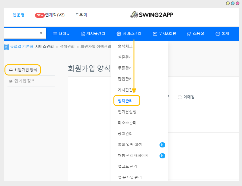 티켓 구매 후, 서비스관리 → 정책관리 → 회원가입 양식 설정 페이지로 이동합니다.