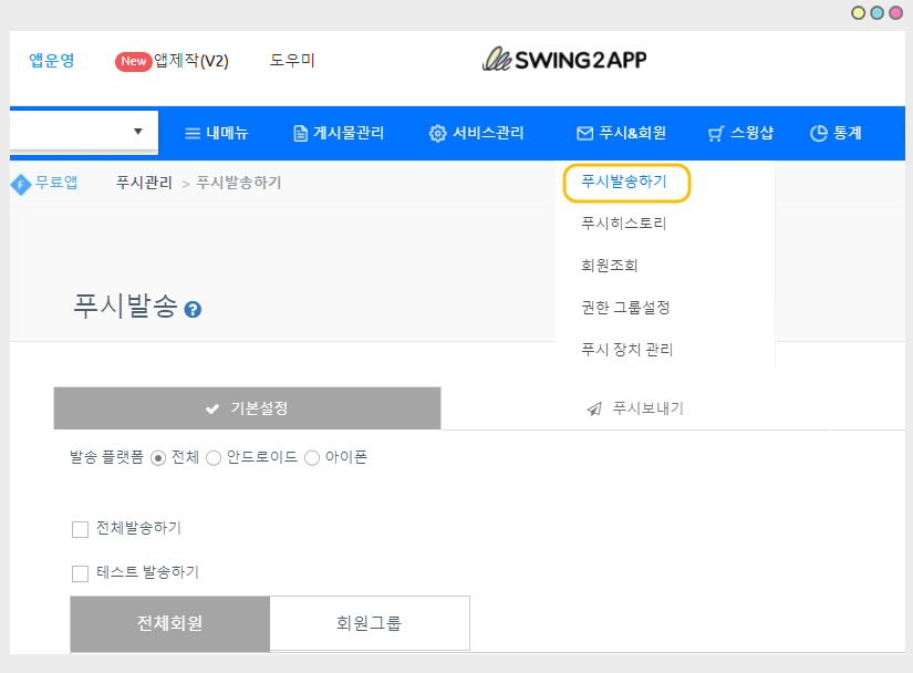 앱운영 페이지 → 푸시&회원 → 푸시 발송하기 페이지로 이동해주세요.