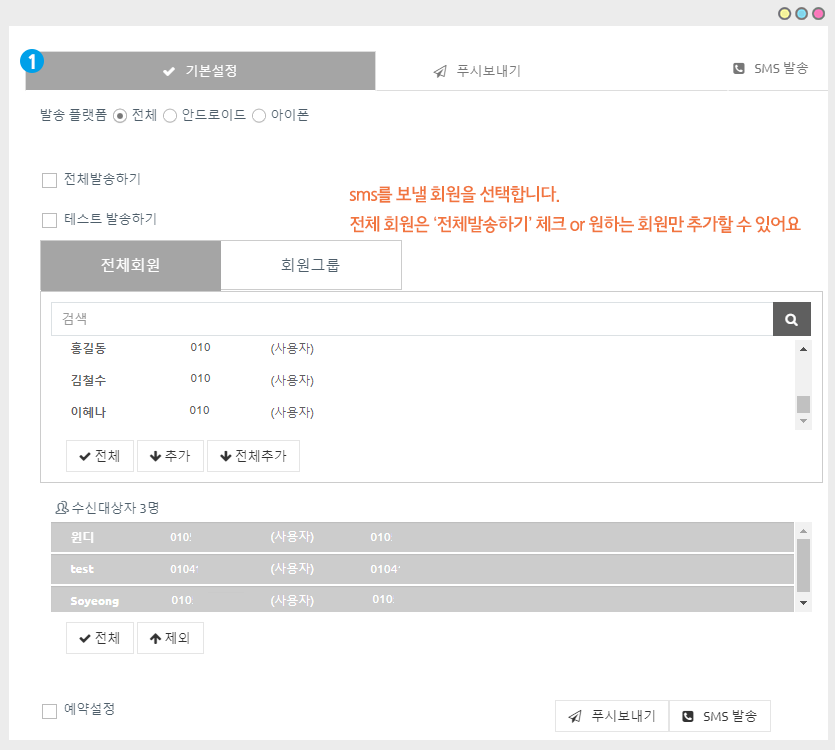 (1)기본설정에서 문자메시지를 보낼 회원을 선택해주세요.