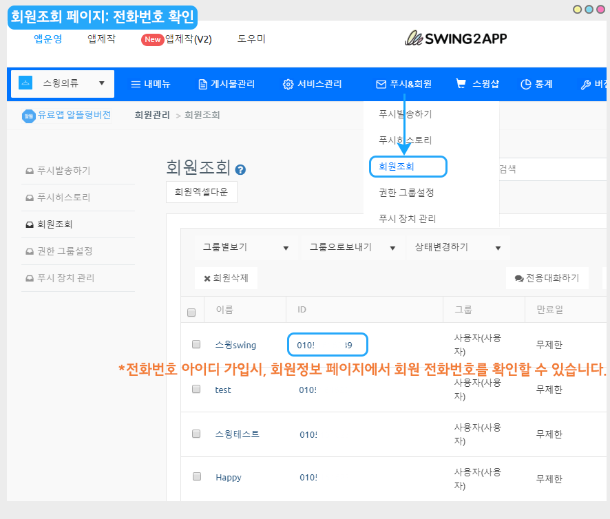 아이디 영역에 회원들이 가입할 때 인증받은 전화번호를 확인할 수 있습니다.