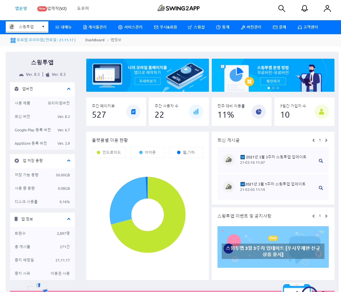 앱 관리자는 앱에 관련된 관리 및 운영은 스윙에서 제공하는 앱운영페이지(대시보드)에서 진행할 수 있는데요.