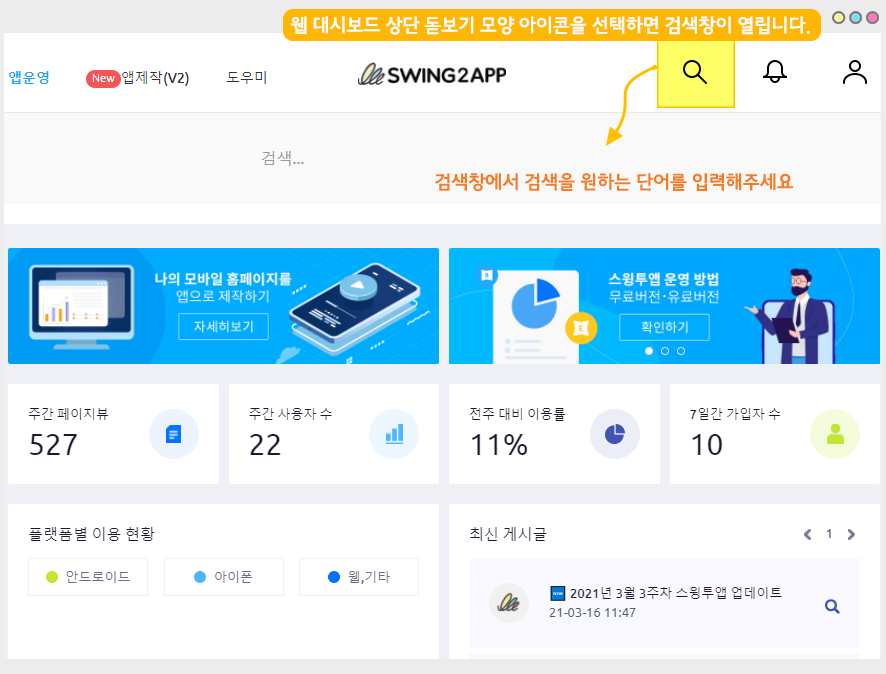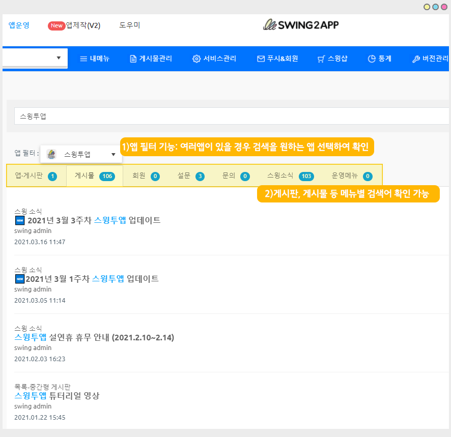 스윙투앱 앱운영페이지에서 제공하는 [전체 검색 기능] 이용방법