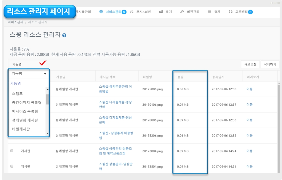매뉴얼을 통해서 리소스 관리(용량관리) 이용방법을 확인해주세요.