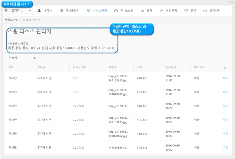 리소스 관리자 상단에 보시면 현재 앱 용량 사용율, 제공 용량, 현재 사용 용량, 잔여 사용가능 용량이 표시됩니다.