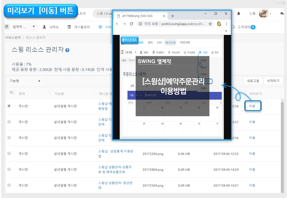 그래서 미리보기에 [이동] 버튼을 선택하면 어떤 이미지를 등록했는지 확인할 수 있어요.