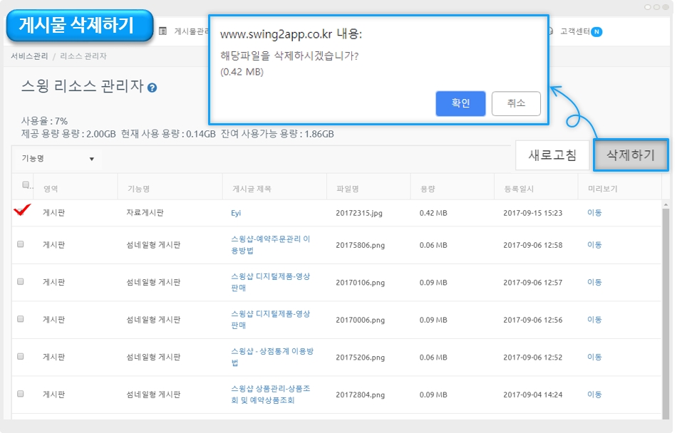 용량을 차지하고 있는 게시물 중, 필요가 없는 게시물은 게시물 선택 후 [삭제하기] 버튼을 선택해서 삭제할 수 있어요.