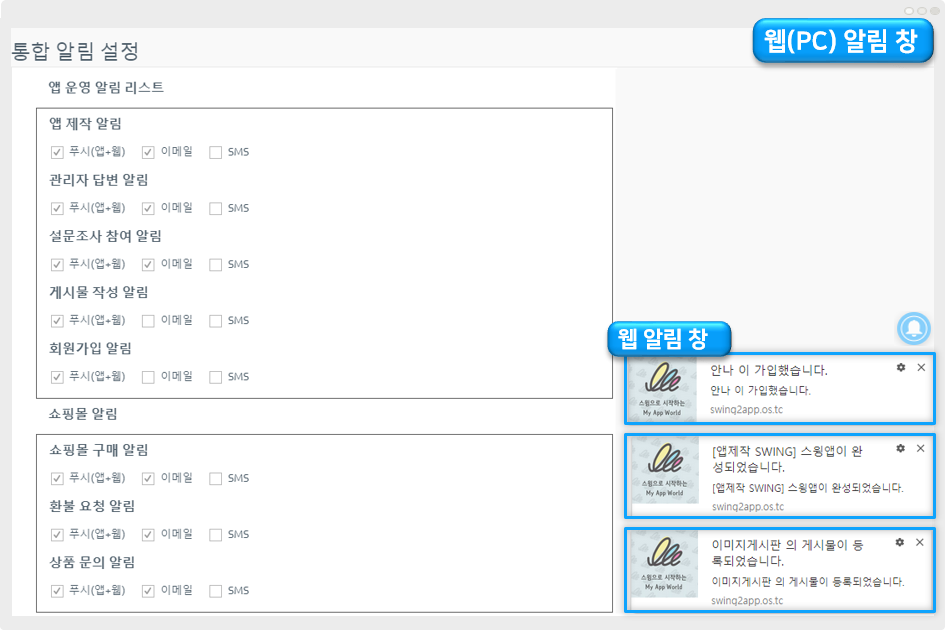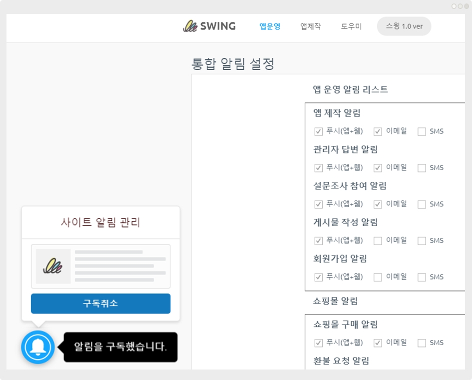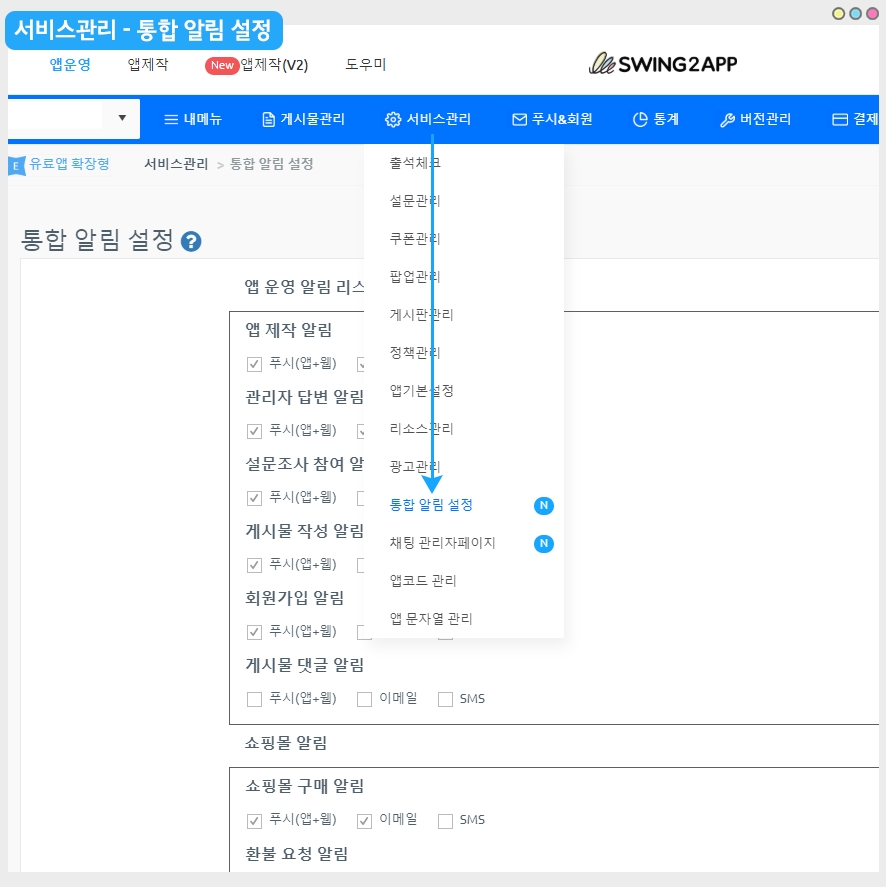 스윙 홈페이지 접속 후 앱운영 페이지에서 → 서비스관리 → [통합 알림 설정] 으로 이동합니다.