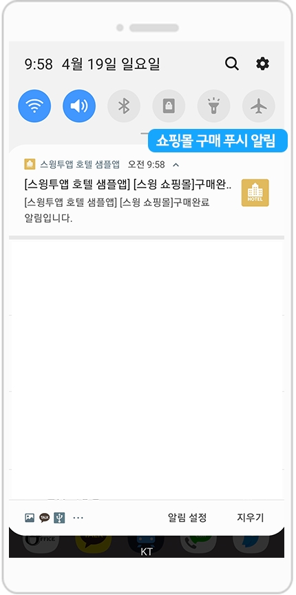 앱에서 사용자의 구매가 완료되면 관리자 앱으로 구매완료 푸시 알림이 들어옵니다.
