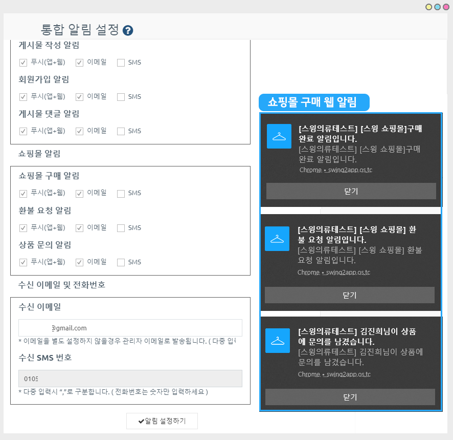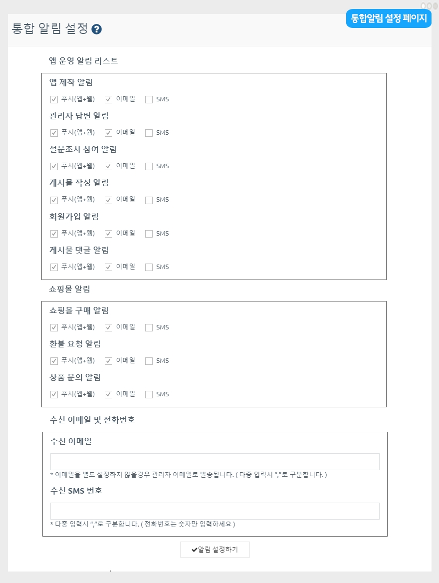 통합 알림 설정 페이지에는앱 운영 알림 리스트, 쇼핑몰 알림, 수신 이메일 및 전화번호 메뉴를 제공하고 있습니다.