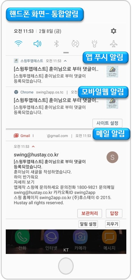 2)앱: 앱에서 통합알림 푸시가 발송됩니다.*앱은 반드시 관리자로 로그인 되어 있어야 합니다.