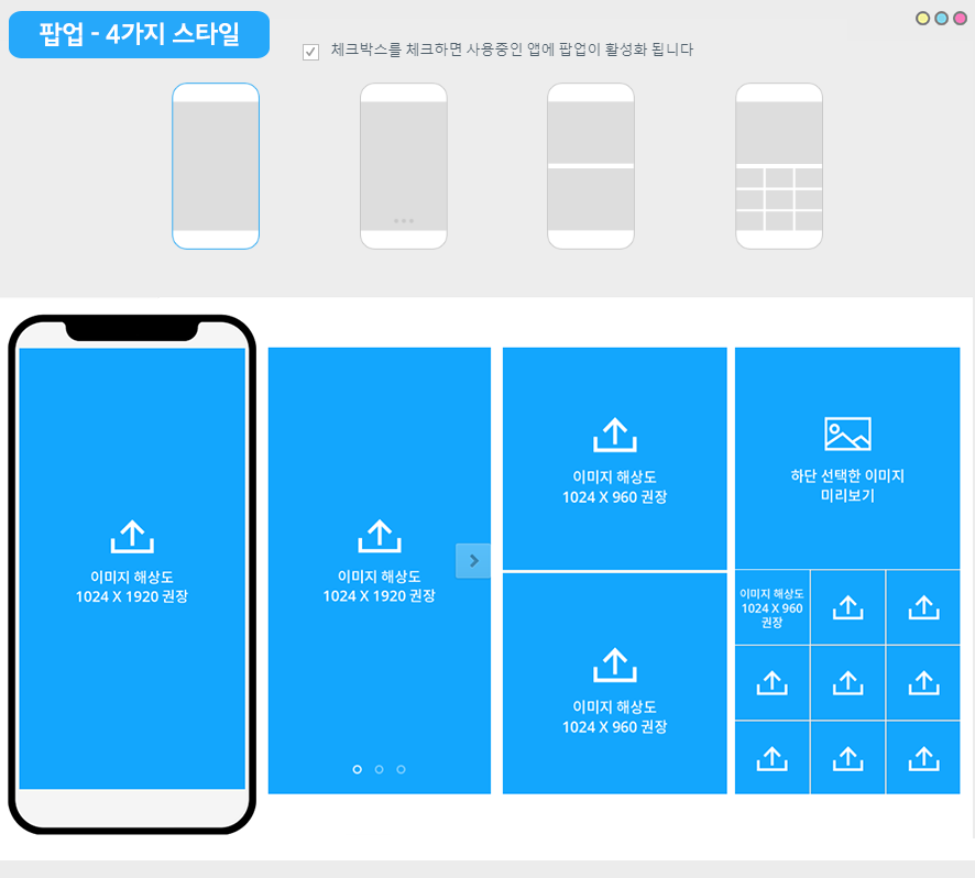두 번째 스타일은 이미지를 3장을 등록해야 하니, 미리 팝업에 적용할 이미지를 준비해주세요.(1024px*1920px)