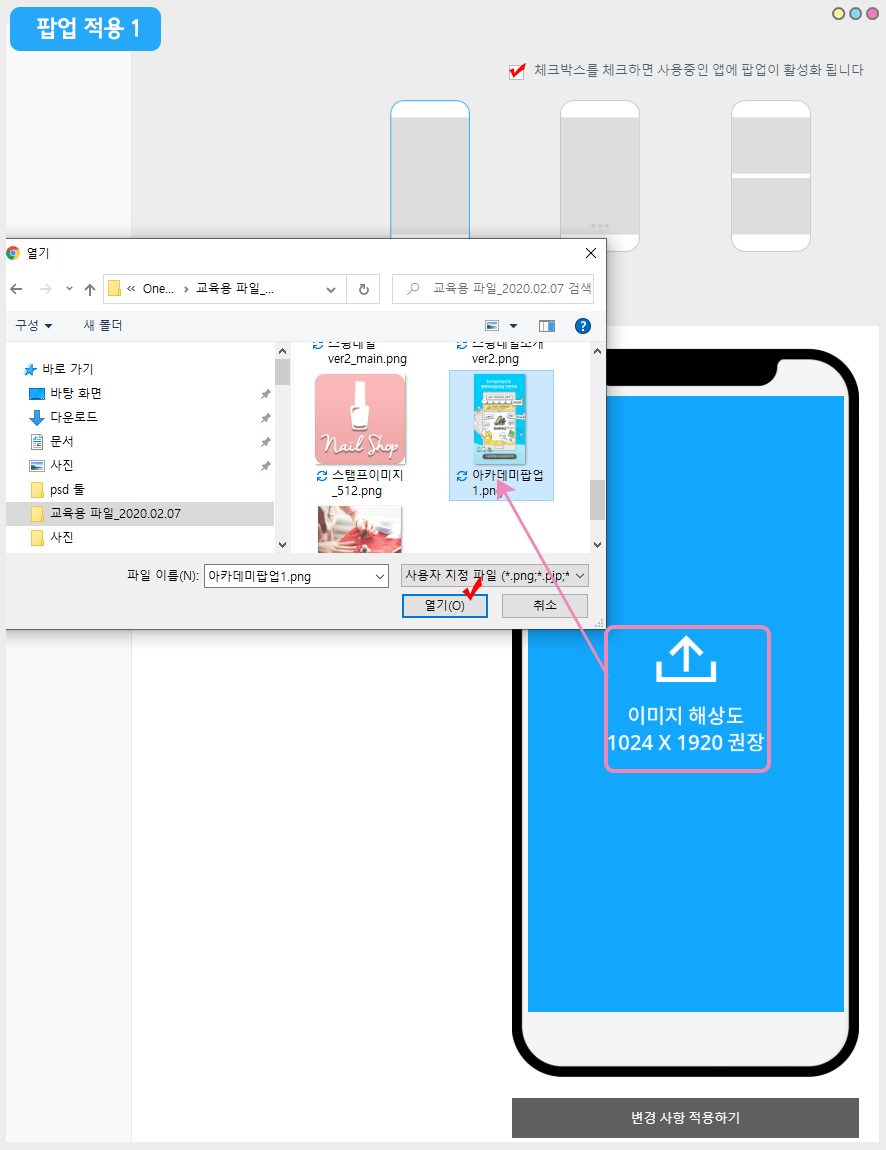 *팝업 이미지 해상도를 보시고, 팝업에 사용할 이미지는 먼저 만들어주셔야 합니다. (1024px*1920px)