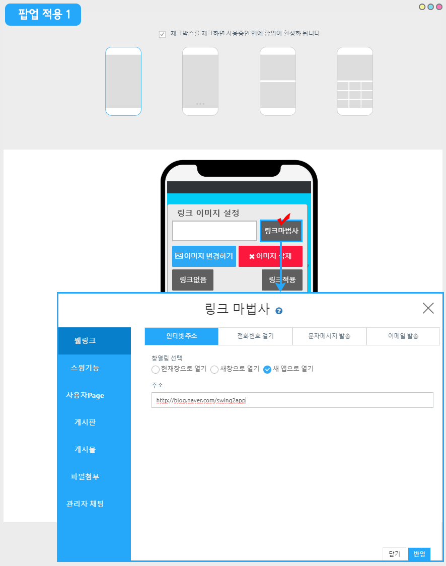 링크 이미지 설정은 팝업창 이미지를 선택시, 연동된 페이지로 이동하게 하는 기능이에요.