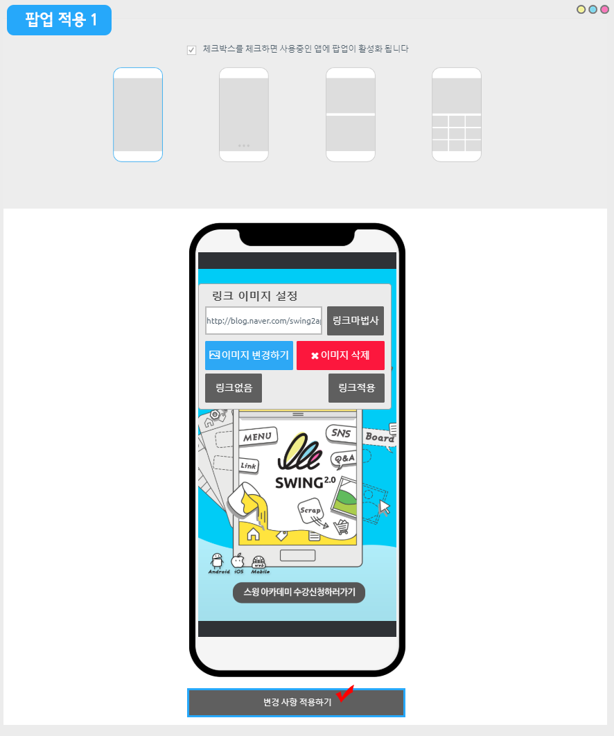 스윙투앱에서 제공하는 팝업 스타일은 총 4가지이구요.