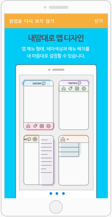 스윙앱에서 팝업 서비스를 제공하고 있으며, 다양한 스타일 중에서 원하는 스타일을 선택해서 팝업을 앱에 적용할 수 있습니다.